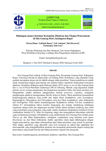 Thoriq, Ilham and Zahidah, Hasan and Yuli, Andriani and Heti, Herawati and Fachmijany, Sulawesty (2020) Hubungan antara struktur komunitas plankton dan tingkat pencemaran di Situ Gunung Putri, Kabupaten Bogor. Limnotek : Perairan Darat Tropis di Indonesia, 27 (2): 2. pp. 79-92. ISSN 2549-8029