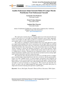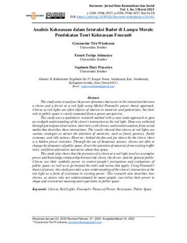 Gymnastiar, Tira Wicaksana and Fatach, Toriqo Abimanyu and Septianto, Hary Prassetyo (2023) Analisis kekuasaan dalam interaksi Badut di lampu merah: pendekatan teori kekuasaan Foucault. Harmoni, 1 (1). pp. 46-58. ISSN 2986-3457