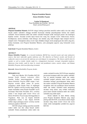 Program Keandalan Manusia. BATAN sebagai lembaga penelitian memiliki reaktor nuklir riset dan cukup banyak sumber radioaktif, sehingga memiliki kerawanan terhadap penyalahgunaan fasilitas dan sumber radioaktif. Sistem keamanan nuklir dan sumber radioaktif bertujuan untuk mencegah potensi dan memitigasi kejadian tersebut. Ancaman tersebut dapat berasal dari orang luar, maupun insider. Kekecewaan, frustasi, ketidakpuasan, merasa diabaikan, tidak dihargai, dan dendam yang tidak ditangani dapat menjadi motivasi menjadi insider. Penangkalan adanya insider dapat dilakukan dengan sistem penghargaan dan sanksi yang jelas, budaya keamanan, serta Program Keandalan Manusia, yaitu penanganan pegawai yang bermasalah secara psikologi.