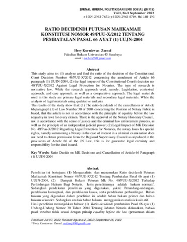 Hery Kurniawan, Zaenal (2022) Ratio decidendi putusan Mahkamah Konstitusi Nomor 49/PUU-X/2012 Tentang Pembatalan Pasal 66 Ayat (1) UUJN-2004. Jurnal Hukum, Politik dan Ilmu Sosial, 1 (3): 16. pp. 184-193. ISSN 2963-8704
