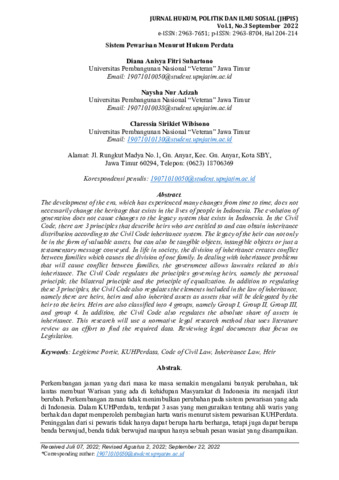 Diana Anisya Fitri, Suhartono and Naysha Nur, Azizah and Claressia Sirikiet, Wibisono (2022) Sistem pewarisan menurut hukum perdata. Jurnal Hukum, Politik dan Ilmu Sosial, 1 (3): 18. pp. 204-214. ISSN 2963-8704
