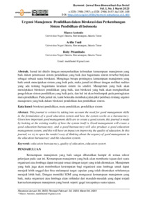 Jurnal ini ditulis dengan memperhatikan kebutuhan kemampuan manajemen yang baik dalam perumusan sistem pendidikan yang baik dan bagaimana sistem tersebut berjalan sebagai sebuah suatu birokrasi. Mengingat betapa pentingnya kemampuan manajemen yang baik untuk menciptakan sistem yang baik pula, maka jurnal ini dibuat dengan melihat realitas yang ada tentang bagaimana keadaan sistem itu sendiri. Manajemen yang baik akan menciptakan birokrasi pendidikan yang baik, dan birokrasi yang baik akan menghasilkan pengelolaan sistem pendidikan yang baik pula, dan hal ini akan berdampak pada peningkatan mutu pendidikan. Pada jurnal ini, kami berusaha membuka jalan pikir pembaca tentang urgensi manajemen yang baik dalam birokrasi pendidikan dan pendidikan sistem.