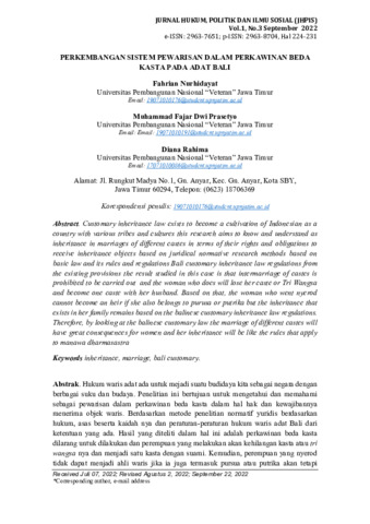 Fahrian, Nurhidayat and Muhammad Fajar Dwi, Prasetyo and Diana, Rahima (2022) Perkembangan sistem pewarisan dalam perkawinan beda kasta pada adat Bali. Jurnal Hukum, Politik dan Ilmu Sosial, 1 (3): 20. pp. 224-231. ISSN 2963-8704