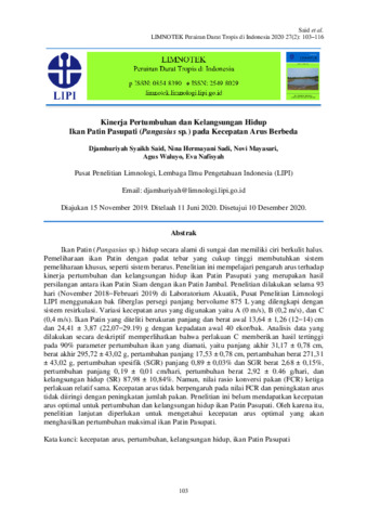 Djamhuriyah, Syaikh Said and Nina, Hermayani Sadi and Novi, Mayasari and Agus, Waluyo and Eva, Nafisyah (2020) Kinerja pertumbuhan dan kelangsungan hidup ikan Patin Pasupati (Pangasius sp.) pada kecepatan arus berbeda. Limnotek : Perairan Darat Tropis di Indonesia, 27 (2): 4. pp. 103-116. ISSN 2549-8029