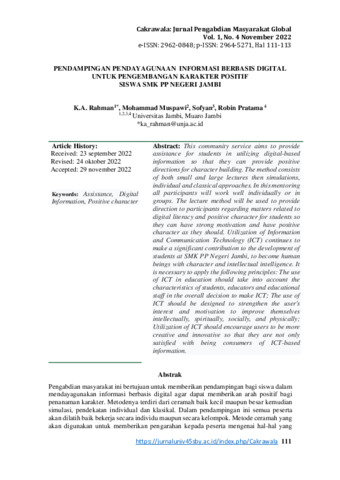 K., A. Rahman and Mohammad, Muspawi and Sofyan, Sofyan and Robin, Pratama (2022) Pendampingan pendayagunaan informasi berbasis digital untuk pengembangan karakter positif siswa SMK PP Negeri Jambi. Cakrawala: Jurnal Pengabdian Masyarakat Global, 1 (4): 14. pp. 111-113. ISSN 2964-5271