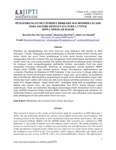 Roostafa, Eka Nur Sarwendah and Kharisma, Eka Putri and Abdul, Aziz Hunaifi (2023) Pengembangan multimedia berbasis macromedia flash pada materi sistem tata surya untuk siswa sekolah dasar. Jurnal Inovasi Pendidikan dan Teknologi Informasi, 4 (1). 01-08. ISSN 2987-8462