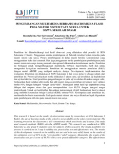 Penelitian ini dilatarbelakangi dari hasil observasi yang dilakukan oleh peneliti di SDN Sukorame 2 Kediri. Penggunaan media pembelajaran di Sekolah tersebut belum tersedia pada materi sistem tata surya. Proses pembelajaran di kelas masih bersifat konvensional yang menggunakan buku dan ceramah. Dan juga penggunaan media pembelajaran pembelajaran pada materi sistem tata surya kurang menarik dan optimal dikarenakan keterbatasan media. Penelitian ini bertujuan untuk mengembangankan multimedia berbasis macromedia flash dan untuk mengetahui kelayakan multimedia. Penelitian ini menggunakan metode penelitian (R&D) dengan model ADDIE yang meliputi analysis, design, Development, implementation dan evaluation. Penelitian ini dilakukan di SDN Sukorame 2 dan siswa kelas 6 sebagai subjek dari penelitian ini. Proses uji kelayakan media dilakukan 3 tahap yaitu, uji kevalidan, uji kepraktisan dan uji keefektifan. Hasil penelitian pengembangan ini pada uji kevalidan dikatakan sangat valid, berdasarkan hasil validasi ahli media dan ahli materi dengan perolehan persentase skor validasi media 91% dengan kategori “sangat layak/valid”. Sedangkan untuk hasil uji kepraktisan yang didapat dari respons siswa dan guru memperolehan skor 89,5% dengan kategori sangat praktis/layak. Untuk uji keefektifan dinyatakan tuntas/sangat efektif berdasarkan hasil evaluasi yang melebihi ketuntasan belajar klasikal (KBK) sebesar 92%. Kesimpulan dari penelitian ini, multimedia berbasis macromedia flash pada materi sistem tata surya dikatakan layak digunakan pada pembelajaran di kelas pada materi sistem tata surya.