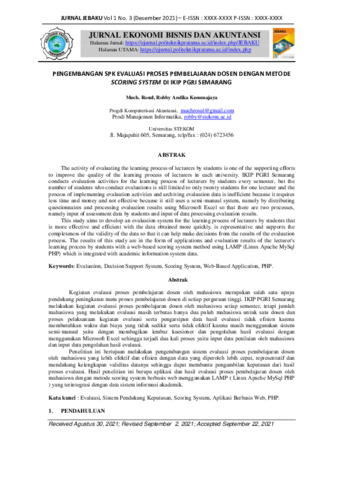 Much., Rosul and Robby, Andika Kusumajaya (2021) Pengembangan SPK evaluasi proses pembelajaran dosen dengan metode scoring system di IKIP PGRI Semarang. Jurnal Ekonomi Bisnis dan Akuntansi, 1 (3): 1. pp. 1-10. ISSN 2827-8364