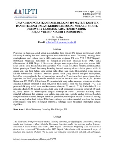 Sri, Herlina (2023) Upaya meningkatkan hasil belajar IPS materi konflik dan integrasi dalam kehidupan sosial melalui model discovery learning pada peserta didik Kelas VIII SMP Negeri 1 Borobudur. Jurnal Inovasi Pendidikan dan Teknologi Informasi, 4 (1). pp. 12-21. ISSN 2987-8462