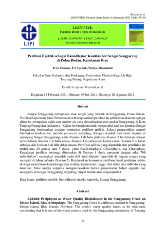 Tewi, Resiana and Tri, Apriadi and Wahyu, Muzammil (2021) Perifiton epilitik sebagai bioindikator kualitas air Sungai Senggarang di Pulau Bintan, Kepulauan Riau. Limnotek : Perairan Darat Tropis di Indonesia, 28 (1): 4. pp. 39-50. ISSN 2549-8029