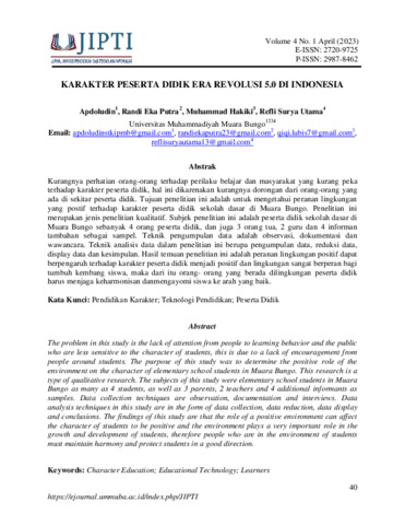 Apdoludin, Apdoludin and Randi, Eka Putra and Muhammad, Hakiki and Refli, Surya Utama (2023) Karakter peserta didik era revolusi 5.0 di Indonesia. Jurnal Inovasi Pendidikan dan Teknologi Informasi, 4 (1). pp. 40-47. ISSN 2987-8462