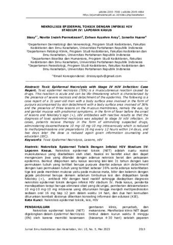 Sissy, Sissy and Novita, Indah Permatasari and Zahwa, Azzahra Arsy and Ismalia, Husna (2023) Nekrolisis epidermal toksik dengan infeksi HIV stadium IV: laporan kasus. Jurnal Ilmu Kedokteran dan Kesehatan, 10 (5). pp. 1-15. ISSN 2549-4864