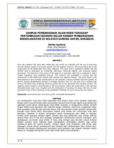 Ristika, Apriliana (2021) Dampak pembangunan jalan MERR terhadap pertumbuhan ekonomi dalam konsep pembangunan berkelanjutan di wilayah Gunung Anyar, Surabaya. Jurnal Ekonomi Bisnis dan Akuntansi, 1 (3): 10. pp. 86-96. ISSN 2827-8364