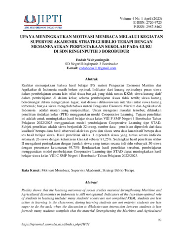 Endah, Wahyuningsih (2023) Upaya meningkatkan motivasi membaca melalui kegiatan supervisi akademik strategi biblio terapi dengan memanfaatkan perpustakaan sekolah pada guru di SDN Ringinputih 3 Borobudur. Jurnal Inovasi Pendidikan dan Teknologi Informasi, 4 (1). pp. 92-102. ISSN 2987-8462