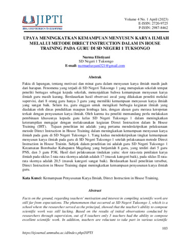 Fakta di lapangan, tentang motivasi dan minat guru dalam menyusun karya ilmiah masih jauh dari harapan. Fenomena yang terjadi di SD Negeri Tuksongo 1 yang merupakan sekolah tempat peneliti bertugas sebagai kepala sekolah, menunjukkan bahwa kemampuan menyusun karya ilmiah guru masih kurang. Berdasarkan hasil observasi awal yang dilakukan peneliti melalui supervisi, dari 8 orang guru hanya 3 guru yang memiliki kemampuan menyusun karya ilmiah yang sangat baik. Selain itu, guru enggan untuk mengikuti berbagia kegiatan ilmiah yang diadakan oleh dinas pendidikan maupun lembaga lain, dengan alasan guru merasa kerepotan terkait dengan penyusunan karya ilmiah. Oleh karena itu peneliti memandang perlu melakukan pembinaan khususnya kepada guru kelas SD Negeri Tuksongo 1 dalam meningkatkan keterampilan mengajar dengan melaksanakan kegiatan Direct Instruction dalam In House Training (IHT). Tujuan penelitian ini adalah: yang pertama mendeskripsikan pelaksanaan metode Direct Instruction in House Training dalam meningkatkan kemampuan menyusun karya ilmiah pada guru di SD Negeri Tuksongo 1. Yang kedua mendeskripsikan tingkat kemampuan menyusun karya ilmiah pada guru di SD Negeri Tuksongo 1 setelah pelaksanaan metode Direct Instruction in House Trainin. Subjek dalam penelitian ini adalah guru SD Negeri Tuksongo 1 Kecamatan Borobudur Kabupaten Magelang yang berjumlah 8 guru, yang terdiri dari 5 guru PNS, dan 3 guru P3K. Hasil dari pelaksanaan tindakan yaitu: skor rata-rata penilaian karya ilmiah pada siklus I rata-rata skornya adalah adalah 17 (masuk kategori baik), pada siklus II ratarata skornya adalah 20,5 (masuk kategori sangat baik). Berdasarkan hasil penelitian tersebut, Direct Instruction in House Training dapat meningkatkan kemampuan penyusunan karya ilmiah guru.