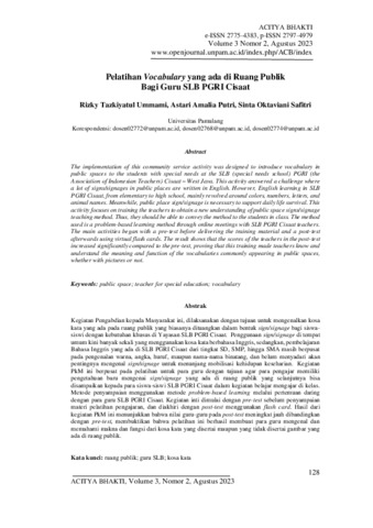 Rizky, Tazkiyatul Ummami and Astari, Amalia Putri and Sinta, Oktaviani Safitri (2023) Pelatihan vocabulary yang ada di ruang publik bagi guru SLB PGRI Cisaat. Acitya Bhakti, 3 (2): 5. pp. 128-137. ISSN 2797-4979