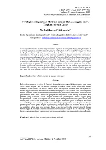 Nur, Laili Indasari and Siti, Amaliati (2023) Strategi meningkatkan motivasi belajar Bahasa Inggris siswa tingkat sekolah dasar. Acitya Bhakti, 3 (2): 6. pp. 138-145. ISSN 2797-4979