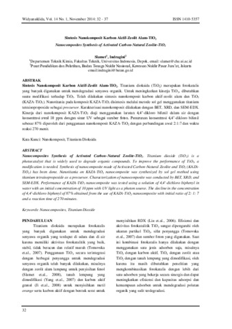 Slamet, Slamet and Indragini, Indragini (2014) Sintesis Nanokomposit Karbon Aktif-Zeolit Alam-TiO2. (Nanocomposites Synthesis of Activated Carbon-Natural Zeolite-TiO2). Widyanuklida, 14 (1). pp. 32-37. ISSN 1410-5357