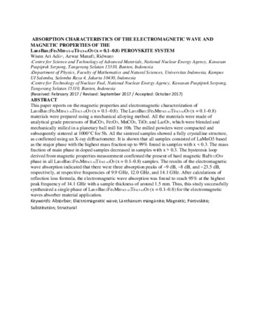 ari adi, wisnu and Manaf, Azwar and Ridwan, Ridwan (2017) ABSORPTION CHARACTERISTICS OF THE ELECTROMAGNETIC WAVE AND MAGNETIC PROPERTIES OF THE La0.8Ba0.2FexMn½(1-x)Ti½(1-x)O3 (x = 0.1–0.8) PEROVSKITE SYSTEM. International Journal of Technology, 5. pp. 887-897. ISSN ISSN 2086-9614