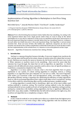 Bilal, Abdul Qowy and Amanda, Muchsin Chalik and Faiz, Hanafi and Andika, Sundawijaya (2022) Implementation of sorting algorithm in marketplace to sort price using insertion sort. Jurnal Teknik Informatika dan Elektro, 4 (1): 6. pp. 60-63. ISSN 2809-7742