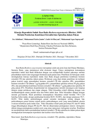Ikan Bada (Rasbora argyrotaenia) merupakan salah satu jenis ikan dari Danau Maninjau, Sumatra Barat, yang mempunyai nilai ekonomi tinggi. Upaya peningkatan kemampuan reproduksi induk ikan Bada dilakukan dengan cara memperbaiki kualitas pakannya melalui penambahan nutrisi dan rangsangan hormonal pada pakan ikan. Penelitian ini bertujuan untuk meningkatkan kinerja reproduksi induk ikan Bada dengan pemberian kombinasi hormon estradiol 17β dan spirulina dalam pakan. Perlakuan yang diuji dalam penelitian ini meliputi pakan kontrol tanpa penambahan hormon estradiol 17β dan spirulina (P0), penambahan hormon estradiol 17β sebesar 7 μg/kg pakan (P1), penambahan spirulina sebesar 30 g/kg pakan (P2), dan penambahan kombinasi hormon estradiol 17β sebesar 7 μg/kg pakan dan spirulina 30 g/kg pakan (P3). Penelitian eksperimental ini menggunakan metode rancangan acak lengkap dengan empat perlakuan dan empat ulangan. Nilai fekunditas relatif dihitung dengan cara membandingkan antara jumlah telur dan bobot induk ikan. Nilai fekunditas didapat dengan metode gravimetrik. Hasil penelitian menunjukkan fekunditas relatif bernilai 730–1.126 butir/kg bobot induk, derajat pembuahan bernilai 80,91–92,90%, dan derajat penetasan 59,7–84,0%. Nilai indeks perkembangan gonad semakin meningkat seiring dengan laju-perkembangan gonad karena terjadi proses perkembangan oosit yang menyebabkan ukuran ovarium membesar pada induk ikan. Nilai fekunditas relatif pada percobaan P2 dan P3 lebih tinggi dibandingkan dengan P0 dan P1. Hal ini dikarenakan peningkatan sintesis vitelogenin diikuti dengan peningkatan jumlah oosit yang akan menyerap vitelogenin tersebut. Penelitian ini membuktikan bahwa penambahan hormon estradiol 17β dan spirulina ke dalam pakan dapat meningkatkan kemampuan reproduksi dan kualitas telur ikan Bada.