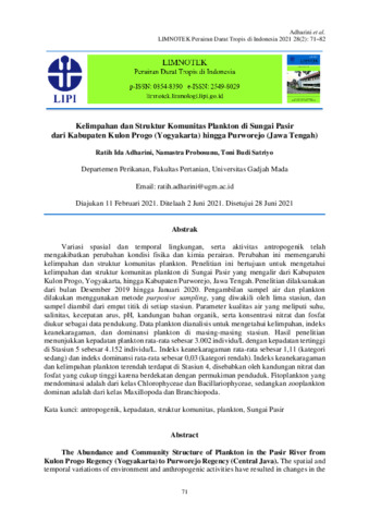 Ratih, Ida Adharini and Namastra, Probosunu and Toni, Budi Satriyo (2021) Kelimpahan dan struktur komunitas plankton di Sungai Pasir dari Kabupaten Kulon Progo (Yogyakarta) hingga Purworejo (Jawa Tengah). Limnotek : Perairan Darat Tropis di Indonesia, 28 (2): 2. pp. 71-82. ISSN 2549-8029
