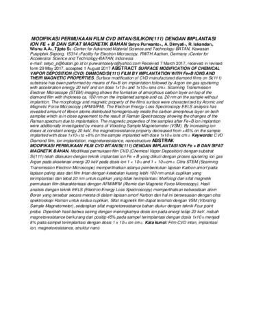 Modifikasi permukaan film CVD (Chemical Vapor Deposition) dengan substrat Si(111) telah dilakukan dengan teknik implantasi ion Fe + B yang diikuti dengan proses sputering ion gas Argon pada akselerasi energi 20 keV pada dosis ion 1 × 1015 and 1 × 1016 cm-2. Citra STEM (Scanning Transmission Electron Microscope) memperlihatkan adanya pembentukan lapisan Karbon amorf pada lapisan paling atas dari film Intan dengan ketebalan kurang lebih 100 nm untuk cuplikan yang terimplantasi dan tebal 20 nm untuk cuplikan yang tidak terimplantasi. Morfologi dan sifat magnetik permukaan film dikarakterisasi dengan AFM/MFM (Atomic dan Magnetic Force Microscopy). Hasil analisis dengan teknik EELS (Electron Energy Loss Spectroscopy) memperlihatkan keberadaan atom Boron yang tersebar secara merata di dalam lapisan amorf Karbon dan hal ini bersesuaian dengan citra spektroskopi Raman untuk kedua cuplikan. Sifat magnetik film dapat teramati dengan VSM (Vibrating Sample Magnetometer), sedangkan sifat magnetoresistance bahan diukur dengan teknik Four point probe. Diperoleh hasil bahwa seiring dengan meningkatnya dosis ion pada energi tetap 20 keV, nisbah magnetoresistance berkurang dari positip 45% pada sampel terimplantasi dengan dosis 1x1015 menjadi 8% pada sampel terimplantasi dengan dosis 1 x 1016 ion cm-2. Kata kunci: Film CVD intan, implantasi ion, magnetoresistance, struktur nano
