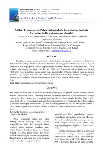 Efriana, Salmia and Rizkan, Fahmi and Iwan, Hasri and Anwar, Hidayat Dahri and Faidha, Rahmi (2021) Aplikasi beberapa jenis pakan terhadap laju pertumbuhan dan laju mortalitas rotifera (Brachionusplicatilis). Mahseer: Jurnal Ilmu-ilmu Perairan dan Perikanan, 4 (1): 5. pp. 39-44. ISSN 2809-8374