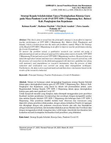 Rahman, Kambi and Radiatan, Mardiah and Fitri, Rezki Amaliah and Putra, Ananda Pratama Ali (2023) Strategi kepala sekolah dalam upaya meningkatkan kinerja guru pada masa pandemi Covid-19 di UPT SDN 2 Majannang Kec. Balocci Kab. Pangkajene dan Kepulauan. Sammajiva, 1 (1). pp. 39-56. ISSN 2986-0415