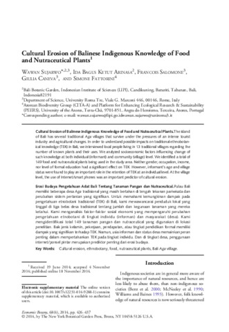 Wawan, Sujarwo and Ida, Bagus Ketut Arinasa and Francois, Salomone and Giulia, Caneva (2014) Cultural erosion of Balinese indigenous knowledge of food and nutraceutical plants. Economic Botany, 68 (4). pp. 426-437. ISSN 18749364
