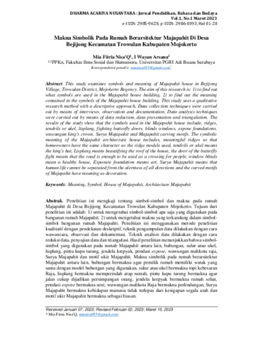 Mia, Fitria Nisa'Q and I Wayan, Arsana (2023) Makna simbolik pada rumah berarsitektur Majapahit di Desa Bejijong Kecamatan Trowulan Kabupaten Mojokerto. Dharma Acariya Nusantara, 1 (1). 01-20. ISSN 2986-0393