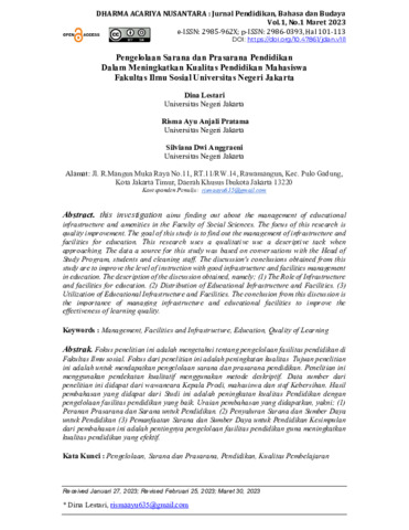 Dina, Lestari and Risma, Ayu Anjali Pratama and Silviana, Dwi Anggraeni (2023) Pengelolaan sarana dan prasarana pendidikan dalam meningkatkan kualitas pendidikan mahasiswa fakultas ilmu sosial Universitas Negeri Jakarta. Dharma Acariya Nusantara, 1 (1). pp. 101-113. ISSN 2986-0393