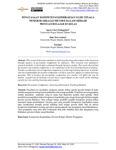 Agnes, Clara Nainggolan and Dela, Novi Ardani and Faridah, Faridah (2023) Penguasaan kompetensi kepribadian oleh tenaga pendidik sebagai metode dalam meraih prestasi belajar di kelas. Dharma Acariya Nusantara, 1 (1). pp. 114-124. ISSN 2986-0393