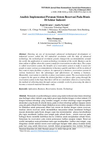 Ranti, Kivania and Amelia, Novianti and Ricky, Firmansyah (2023) Analisis implementasi peranan sistem reservasi pada bisnis di sektor industri. Tuturan, 1 (1). pp. 14-28. ISSN 2985-9743