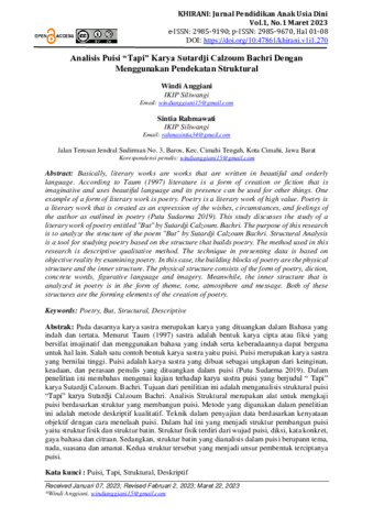 Windi, Anggiani and Sintia, Rahmawati (2023) Analisis puisi “Tapi” karya Sutardji Calzoum Bachri dengan menggunakan pendekatan struktural. Khirani, 1 (1). pp. 1-8. ISSN 2985-9670