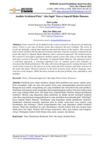 Penelitian puisi dapat diartikan sebagai hasil penelitian atau proses analisis puisi. Puisi merupakan salah satu jenis dari gendre sastra yang mengungkapkan perasaan penyair. Rangkaian kata indah, mengandung arti yang mendalam dan menyentuh hati para pembaca. Penelitian ini bertujuan untuk mengetahui dan mendeskripsikan struktur fisik dan struktur batin puisi yang terdapat dalam puisi Aku Ingin karya Sapardi Djoko Damono dengan pendekatan struktural. Metode yang digunakan dalam penelitian ini adalah metode deskriptif kualitatif yaitu ilmu yang bertujuan menggambarkan isi yang mendalam dan utuh pada puisi “Aku Ingin” karya Sapardi Djoko Damono. Pendekatan yang digunakan adalah pendekatan struktural, pendekatan struktural mencoba menelaah puisi ke dalam unsur-unsur atau struktur yang membangun dan berfungsi. Teknik pengumupulan data yang digunakan adalah membaca literatur. Hasil dari penelitian ini yaitu ditemukanya seluruh struktur fisik dan struktur batin dalam puisi Aku Ingin. Struktur fisik berupa wujud puisi, diksi, gaya bahasa, kata kongkret, citraan. Sedangkan struktur batin berupa tema, nada, suasana, dan amanat.