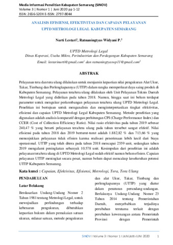 Nurti, Lestari and Ratnaningtyas, Widyani P (2020) Analisis efisiensi, efektivitas dan capaian pelayanan UPTD Metrologi Legal Kabupaten Semarang. Sinov: Media Informasi Penelitian Kabupaten Semarang, 2 (1): 1. pp. 1-12. ISSN 2656-520X