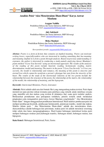 Anggun, Nabilla and July, Indrianti and Riska, Maulani (2023) Analisis Puisi “Aku Mencintaimu Diam-Diam” Karya Anwar Maulana. Khirani, 1 (1). pp. 50-54. ISSN 2985-9670