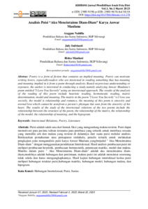 Puisi adalah salah satu dari bentuk fiksi yang mengandung makna tersirat. Puisi dapat memotivasi para pecinta tulisan terutama para pembaca yang tertarik untuk membaca sesuatu yang memiliki arti dan makna yang tersirat di dalamnya dari suatu puisi melalui analisis. Berdasarkan pemahaman atau pemaparan terdahulu, penulis tertarik untuk melakukan pengkajian yaitu menganalisis puisi karya Anwar Maulana yang berjudul " Aku Mencintaimu Diam-diam " dengan menggunakan pendekatan Intertekstual. Hasil analisis pembacaan puisi ini meliputi pembacaan heuristik, pembacaan hermeunetik, penentuan matriks, model dan makna. Matriks dalam puisi " Aku Mencintaimu Diam-diam" adalah aku mencintaimu diam-diam,modelnya adalah hubungan dan percintaan, makna puisi ini adalah mencintai seseorang tidak selalu dan harus mengungkapkannya. Hasil kajian hubungan intertektual kedua puisi meliputi hubungan struktur puisi,hubungan matriks, hubungan model, hubungan makna, dan hipogram.