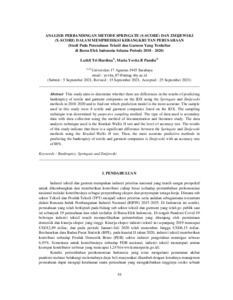 Luthfi, Tri Hardina and Maria, Yovita R Pandin (2021) Analisis perbandingan metode Springate (S-score) dan Zmijewski (X-score) dalam memprediksi kebangkrutan perusahaan (Studi pada perusahaan tekstil dan garmen yang terdaftar di Bursa Efek Indonesia selama periode 2018 - 2020). Akuntansi'45: Jurnal Ilmiah Akuntansi, 2 (2): 1. pp. 44-52. ISSN 2828-7215