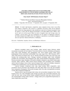 In today's tight business competition, many companies always want to stay afloat from business competitors. This research is a qualitative descriptive study with an approach that is carried out using quantitative data calculations in the form of financial statements. From the analysis, it shows that the financial performance of PT Bayu Buana Tbk in 2008 to 2012 can be said to be still not good. Where in terms of liquidity ratios and leverage ratios, the company is still not able to pay off its obligations. For the analysis of bankruptcy indicators, the results obtained from 2008 to 2012, the company is classified as a very healthy company or does not experience financial difficulties or bankruptcy.