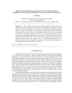 Tax is one of highest sources of state revenue. Qualitative research methods are methods based on the philosophy of postpositivism. The conclusions are as follows: 1. The tax audit carried out by the audit team is in accordance with the guidelines in the Regulation of the Minister of Finance. 2. The results of the calculation of the effectiveness level, in 2015-2018 are included in the effective criteria with a percentage of 100%, and in 2019 they are included in the effective criteria with a percentage of 91.1%.3. The results of the calculation of the level of effectiveness based on the realization of tax audit receipts in 2015-2019 based on targets and the realization of ineffective audits, 4. Factors that affect tax audits include unclear taxpayer addresses, different attitudes of taxpayers, sense of responsibility responsibility of the-examiner, human resources, adequate office facilities, good communication, and support from the leadership and good cooperation between leaders.