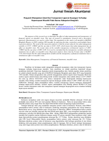 Nurhafizah, Nurhafizah and Siti, Asiam (2021) Pengaruh manajemen zakat dan transparansi laporan keuangan terhadap kepercayaan muzakki pada BAZNAS Kabupaten Bengkalis. Akuntansi'45: Jurnal Ilmiah Akuntansi, 2 (2): 11. pp. 128-140. ISSN 2828-7215