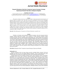 Penelitian ini bertujuan untuk mengetahui pengaruh manajemen zakat dan transparansi laporan keuangan terhadap kepercayaan muzakki. Jenis penelitian ini adalah penelitian kuantitatif dengan pendekatan deskriptif. Kuesioner digunakan untuk mengumpulkan data. Jumlah populasi dalam penelitian ini adalah seluruh muzakki yang ada di BAZNAS Kabupaten Bengkalis pada tahun 2019 yang berjumlah 1203 muzakki. Dalam menganalisis data, peneliti menggunakan analisis regresi linier berganda. Hasil dari analisis regresi adalah dimana nilai thitung untuk variabel manajemen zakat adalah sebesar 2,515>1,98667 dan nilai sig sebesar 0,014<0,05 yang artinya manajemen zakat berpengaruh terhadap kepercayaan muzakki. Nilai thitung variabel transparansi laporan keuangan adalah sebesar 5,208>1,98667 dan nilai sig-0,000<0,05. Sehingga dapat disimpulkan bahwa variabel transparansi laporan keuangan berpengaruh terhadap kepercayaan muzakki. Analisis regresi menunjukkan nilai Fhitung sebesar 66,000>3,10 yang berarti variabel manajemen zakat dan transparansi laporan keuangan berpengaruh secara simultan terhadap kepercayaan muzakki.