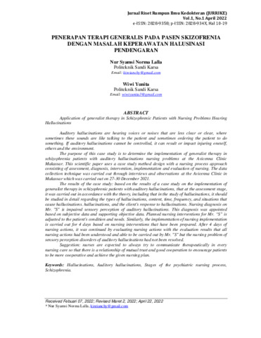 Nur, Syamsi Norma Lalla and Wiwi, Yunita (2022) Penerapan terapi generalis pada pasen skizofrenia dengan masalah keperawatan halusinasi pendengaran. Jurnal Riset Rumpun Ilmu Kedokteran, 1 (1): 2. pp. 10-19. ISSN 2828-934X
