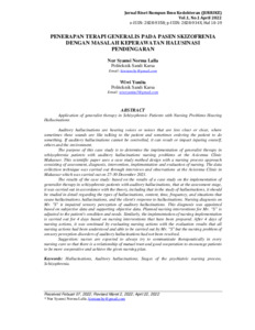 Halusinasi pendengaran adalah mendengar suara atau kebisingan yang kurang jelas ataupun yang jelas, dimana terkadang suara-suara tersebut seperti mengajak bicara pasien dan kadang memerintah pasien untuk melakukan sesuatu. Apabila gangguan halusinasi pendengaran tidak bisa dikontrol, maka dapat mengakibatkan atau dampaknya menciderai diri sendiri, orang lain dan lingkungan. Tujuan dari studi kasus ini adalah untuk mengetahui pelaksanaan penerapan terapi generalis pada pasien skizifrenia dengan masalah keperawatan halusinasi pendengaran di klinik Avicena Makassar. Karya tulis ilmiah ini menggunakan rancangan metode studi kasus dengan pendekatan proses keperawatan yang terdiri dari pengkajian, diagnosa, intervensi, implementasi dan evaluasi keperawatan. Teknik pengumpulan data dilakukan melalui wawancara dan observasi di Klinik Avicena Makassar yang dilakukan pada tanggal 27-30 Desember 2021. Hasil studi kasus: berdasarkan hasil studi kasus tentang penerapah terapi generalis pada pasien skizofrenia dengan masalah halusinasi pendengaran bahwa pada tahap pengkajian sudah dilakukan sesuai dengan teori diantaranya bahwa pada pengkajian halusinasi harus dikaji secara detail mengenai jenis halusinasi, isi, waktu, frekuensi, situasi yang menimbulkan halusinasi, dan respon klien terhadap halusinasi. Diagnose keperawatan pada Tn. “S” yaitu gangguan persepsi sensori halusinasi pendengaran. Diagnose ini diangkat berdasarkan data subjektif dan data objektif yang mendukung. Intervensi keperawatan yang yang direncanakan kepada Tn. “S” disesuaikan dengan kondisi dan kebutuhan pasien. Begitu pula pada pelaksanaan mplementasi keperawatan dilakukan selama 4 hari berdasarkan intervensi keperawatan yang telah disusun. Setelah dilakukan tindakan keperawatan selama 4 hari dilanjutkan dengan melakukan evaluasi tindakan keperawatan dengan hasil evaluasi bahwa semua tindakan keperawatan telah dipahami dan mampu dilakukan oleh Tn”S” namun masalah keperawatan gangguan persepsi sensori halusinasi pendengaran belum teratasi. Saran: diharapkan perawat selalu berusaha berkomunikasi terapeutik dalam setiap melakukan asuhan keperawatan sehingga terjalin hubungan saling percaya dan kerja sama yang baik untuk mendorong pasien lebih kooperatif dan tercapai rencana keperawatan yang diberikan.