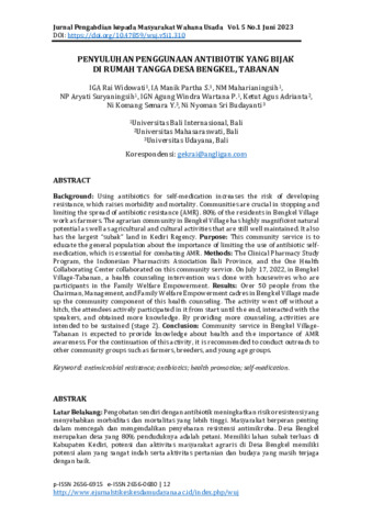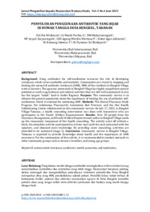 I Gusti, Ayu Rai Widowati and Ida Ayu, Manik Partha Sutema and Ni Made, Maharianingsih and Ni Putu, Aryati Suryaningsih and I Gusti, Ngurah Agung Windra Wartana Putra and Ketut, Agus Adrianta and Ni Komang, Semara Yanti and Ni Nyoman, Sri Budayanti (2023) Penyuluhan penggunaan antibiotik yang bijak di rumah tangga Desa Bengkel, Tabanan. Jurnal Pengabdian kepada Masyarakat Wahana Usada, 5 (1): 2. pp. 12-19. ISSN 2656-6915