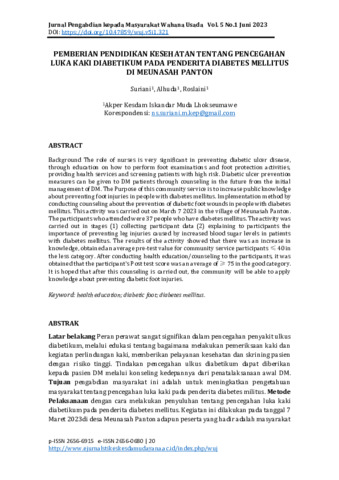 Suriani, Suriani and Alhuda, Alhuda and Roslaini, Roslaini (2023) Pemberian pendidikan kesehatan tentang pencegahan luka kaki diabetikum pada penderita diabetes mellitus Di Meunasah Panton. Jurnal Pengabdian kepada Masyarakat Wahana Usada, 5 (1): 3. pp. 20-25. ISSN 2656-6915