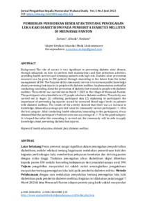 Latar belakang Peran perawat sangat signifikan dalam pencegahan penyakit ulkus diabetikum, melalui edukasi tentang bagaimana melakukan pemeriksaan kaki dan kegiatan perlindungan kaki, memberikan pelayanan kesehatan dan skrining pasien dengan risiko tinggi. Tindakan pencegahan ulkus diabetikum dapat diberikan kepada pasien DM melalui konseling kedepannya dari penatalaksanaan awal DM. Tujuan pengabdian masyarakat ini adalah untuk meningkatkan pengetahuan masyarakat tentang pencegahan luka kaki pada penderita diabetes militus. Metode Pelaksanaan dengan cara melakukan penyuluhan tentang pencegahan luka kaki diabetikum pada penderita diabetes mellitus. Kegiatan ini dilakukan pada tanggal 7 Maret 2023di desa Meunasah Panton adapun peserta yang hadir adalah Masyarakat yang memiliki penyakit diabetes mellitus berjumlah 37 orang. Kegiatan dilakukan dengan tahapan (1) melakukan pendataan peserta (2) menjelaskan kepada peserta tentang pentingnya mencegah luka kaki yang disebabkan oleh peningkatan kadar gula darah pada pasien Diabetes militus. Hasil kegiatan menunjukkan adanya peningkatan pengetahuan didapatkan nilai rata-rata Pre tes peserta pengabdian masyarakat ≤ 40 dengan kategori kurang. Setelah dilakukan pendidikan kesehatan/penyuluhan kepada peserta didapatkan nilai Post tes peserta rata-rata ≥ 75 dengan kategori baik. Diharapkan kepada peserta setelah penyuluhan ini dilaksanakan masyarakat mampu menerapkan pengetahuan tentang pencegahan luka kaki diabetikum.