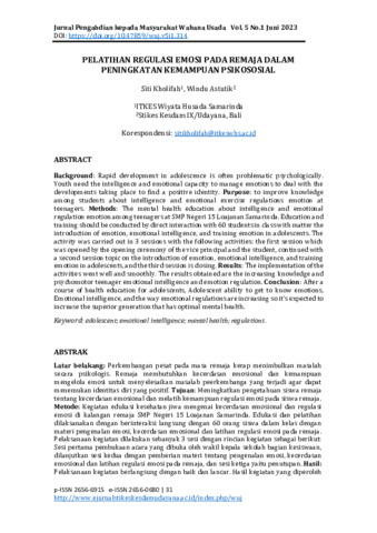 Siti, Kholifah and Windu, Astutik (2023) Pelatihan regulasi emosi pada remaja dalam peningkatan kemampuan psikososial. Jurnal Pengabdian kepada Masyarakat Wahana Usada, 5 (1): 5. pp. 31-36. ISSN 2656-6915